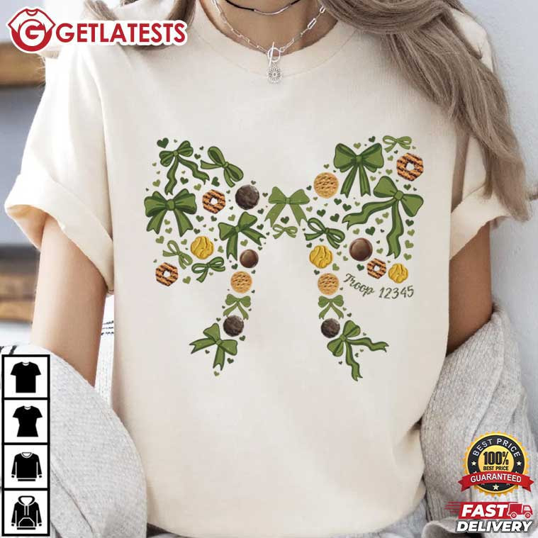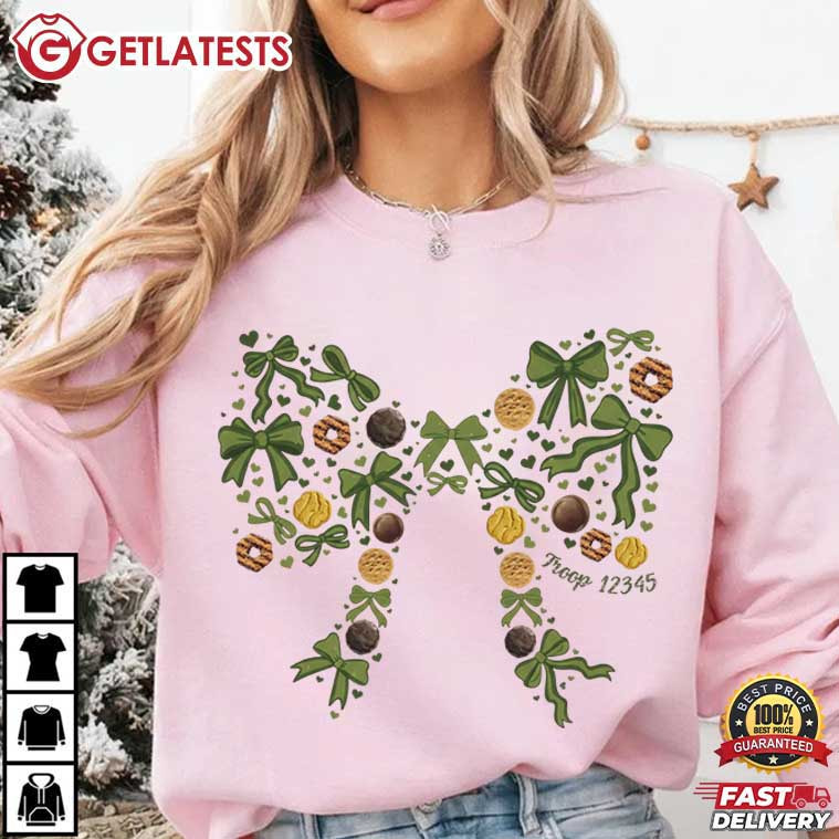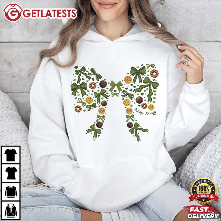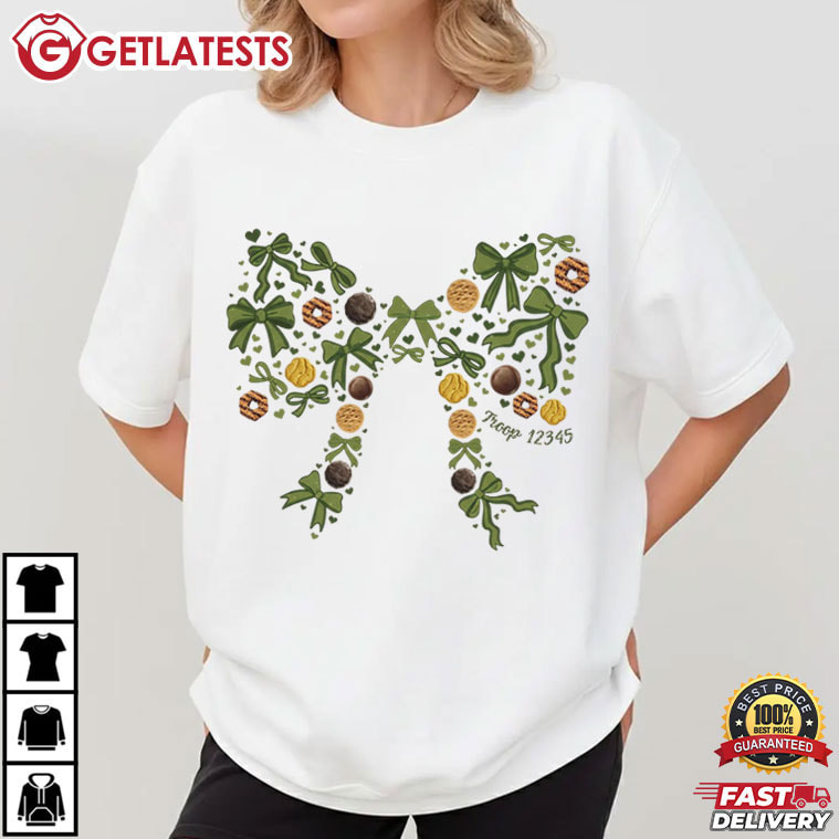 The Custom Subtle Troop Number Cookie Mom Bow Volunteer Gift T-Shirt is made for the moms and volunteers who do everything behind the scenes—and do it with heart. The design forms a soft, bow-shaped composition built from familiar cookie-inspired elements, greenery, and gentle decorative details. The custom troop number is placed discreetly within the design, making the Custom Troop Number shirt personal without being loud.