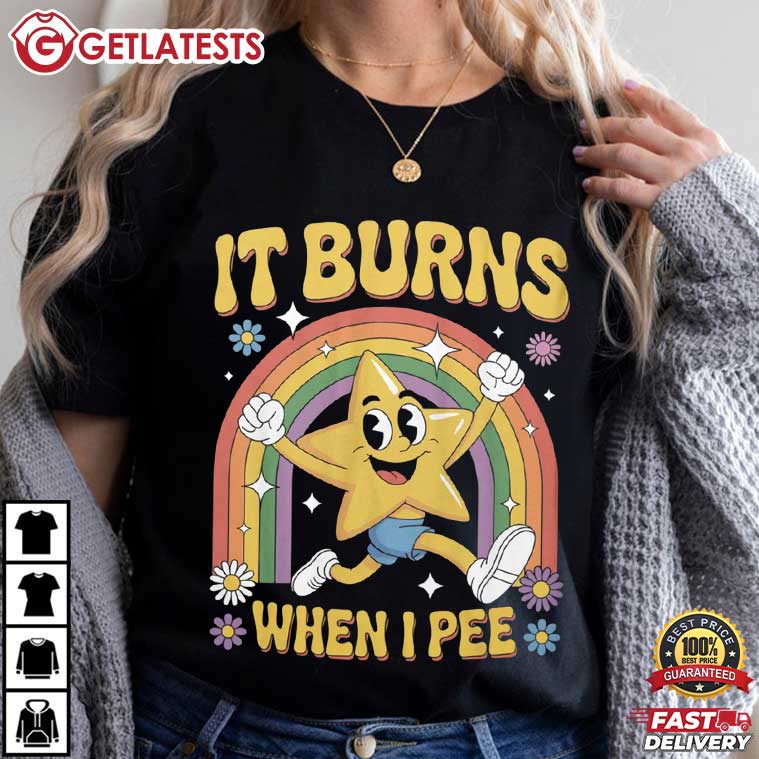 This It Burns When I Pee Funny Saying T-Shirt is the right mix of cute, crazy, and funny for people who like clothes that get people talking. The design has a happy, cartoon-style star character with wide, expressive eyes, white gloves, and lots of animation energy walking confidently under a colorful retro rainbow background. The whole picture appears like a happy 70s kids’ show, with small flowers and sparkles all around it. But when you read the punchline, it changes.