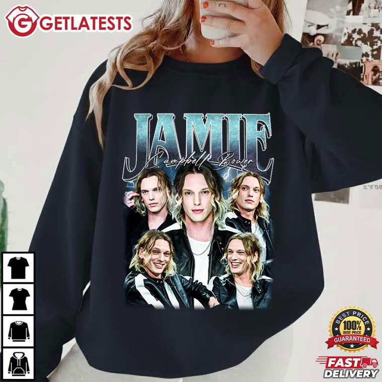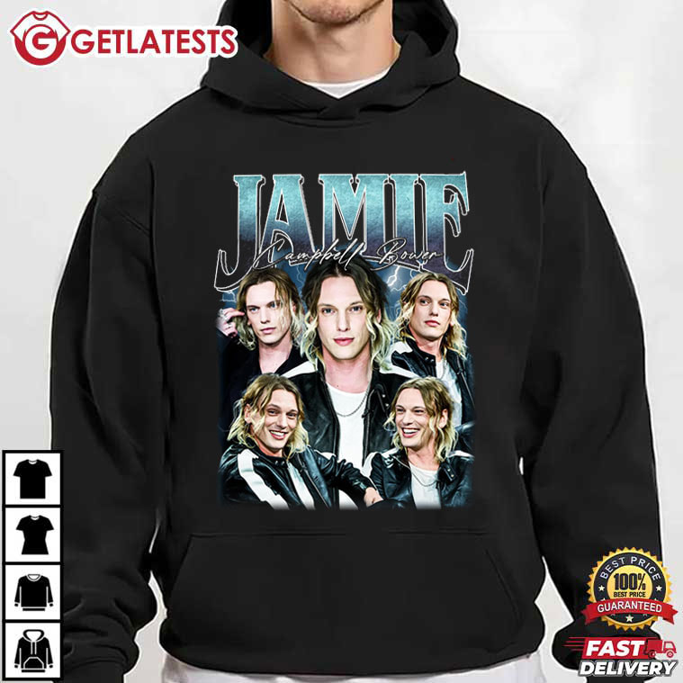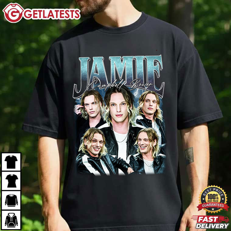 The Jamie Campbell Bower Upside Vintage 90s Bootleg T-Shirt is a love letter to fandom, nostalgia, and underground style — Inspired by classic bootleg concert tees and late-90s celebrity graphics, this design layers multiple portraits of Jamie Campbell Bower into a bold collage that feels raw, expressive, and unapologetically iconic. From the distressed textures to the dramatic lighting, this Jamie Campbell Bower shirt appears to be unique, sentimental, and full of attitude, like something you might find at a record store or vintage market.