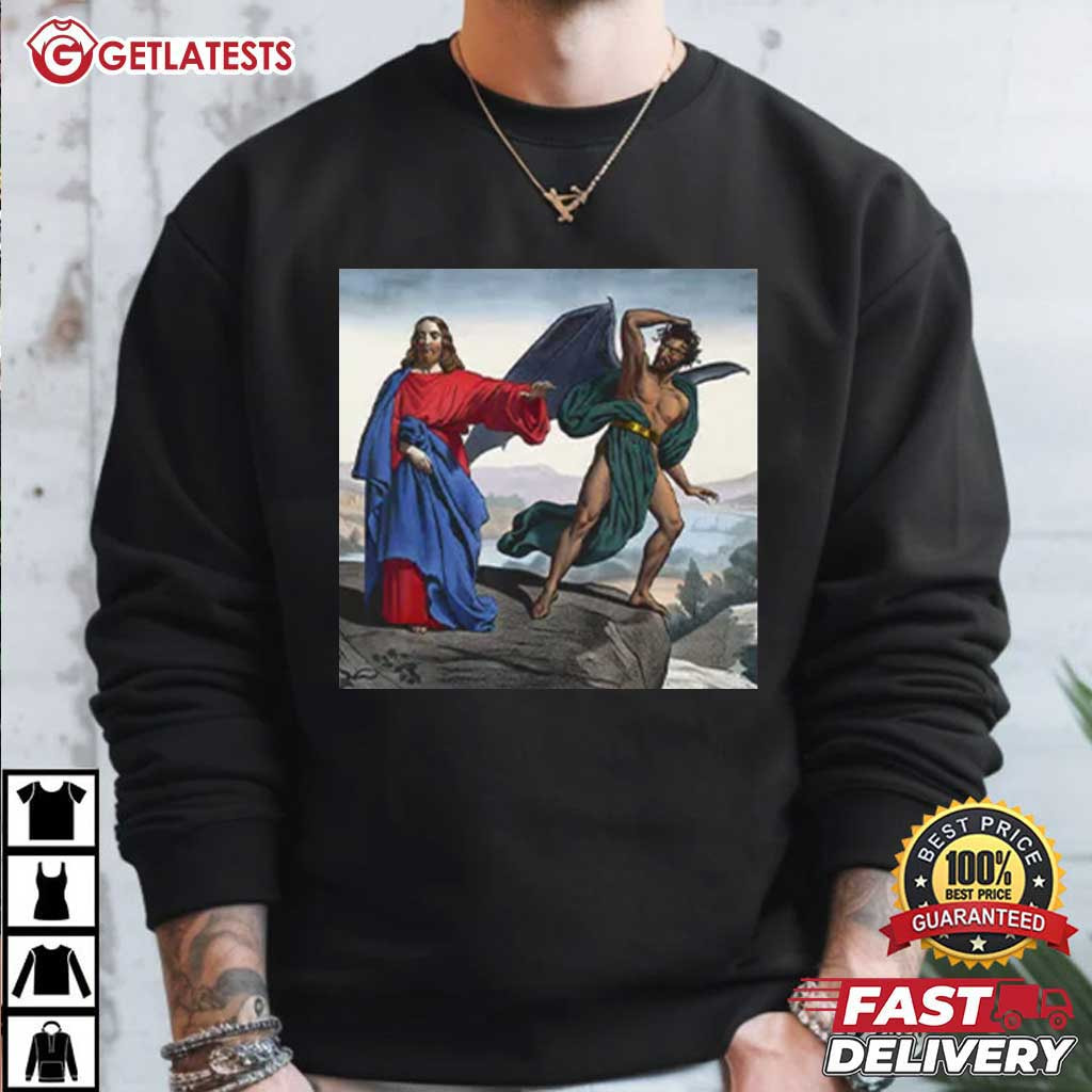 This Jesus Satan Tempts Christ On The Mountain Meme T-Shirt blends classic religious art with modern meme culture, turning a powerful biblical moment into a thought-provoking, conversation-starting design. It’s not cartoonish or loud. Rather, it allows the visual to speak for itself, which makes it entertaining to everyone who sees it, hilarious to some, and important to some.