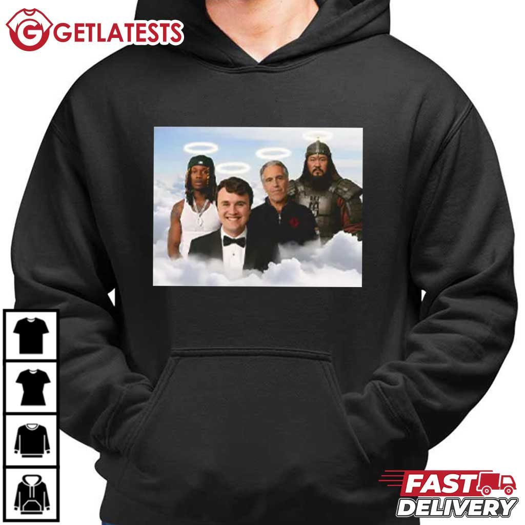 Make a provocative, meme-forward statement with the Legends in Heaven Heavy King Von Charlie Kirk Genghis Khan Jeffrey Epstein T-Shirt—a surreal, tongue-in-cheek graphic that brings together a group of historically and culturally recognizable figures in a deliberately absurd “internet collage” style. This kind of design reflects how modern meme culture flattens timelines and reputations, placing unrelated figures side by side to provoke reactions, debate, and dark humor.