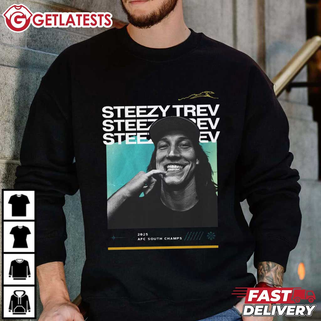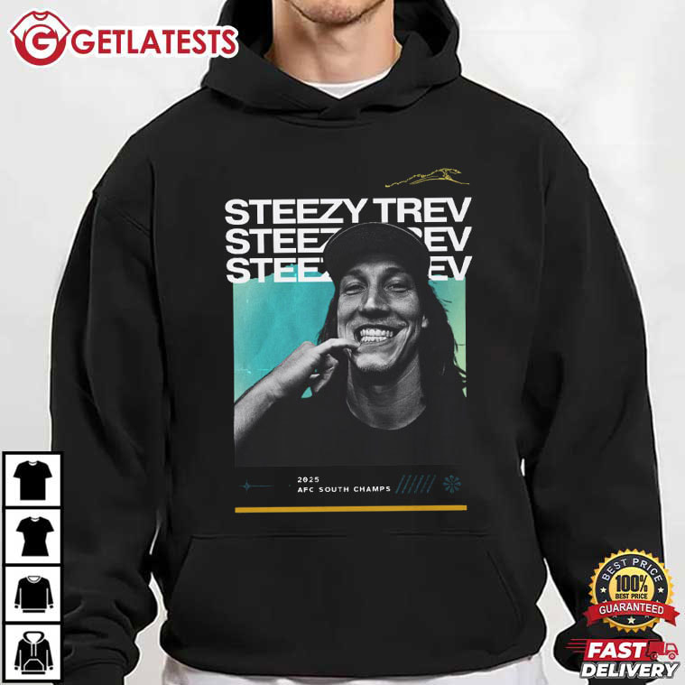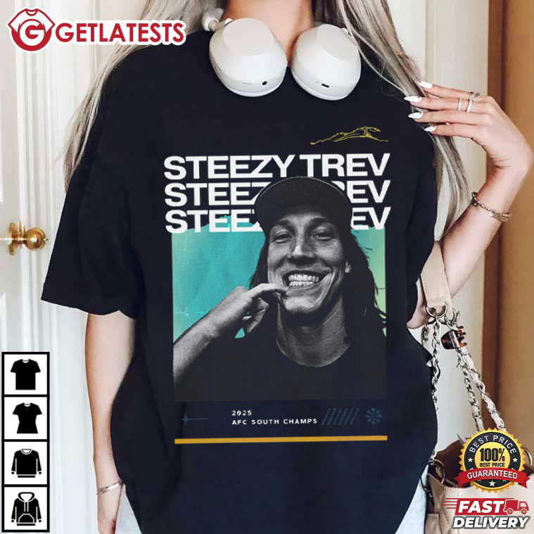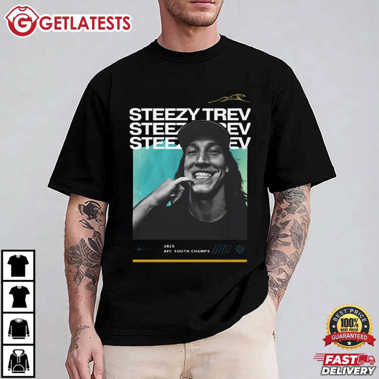Trevor Lawrence Steezy Trev Jacksonville Jaguars 2025 AFC South Champs T-Shirt – custom football jersey, personalized football jersey, football jersey custom design, vintage nfl shirts, nfl player t-shirts