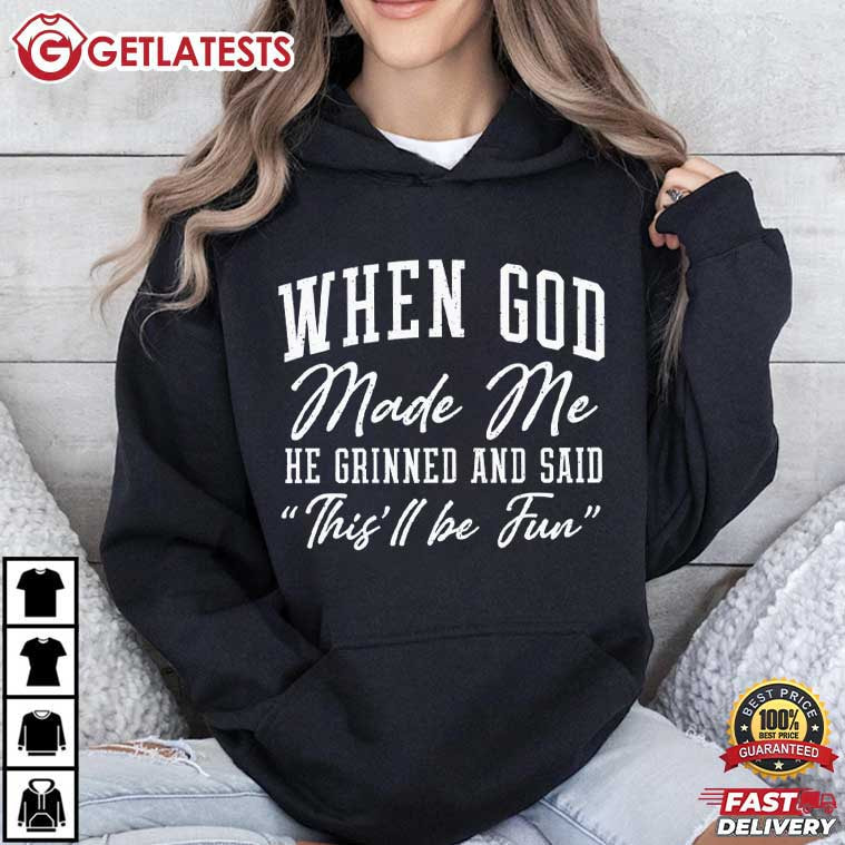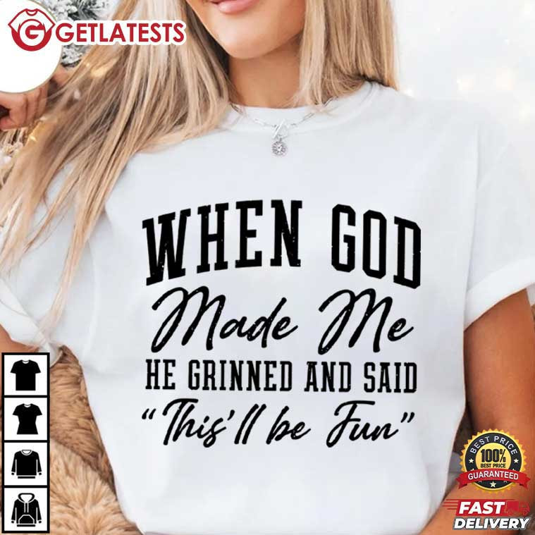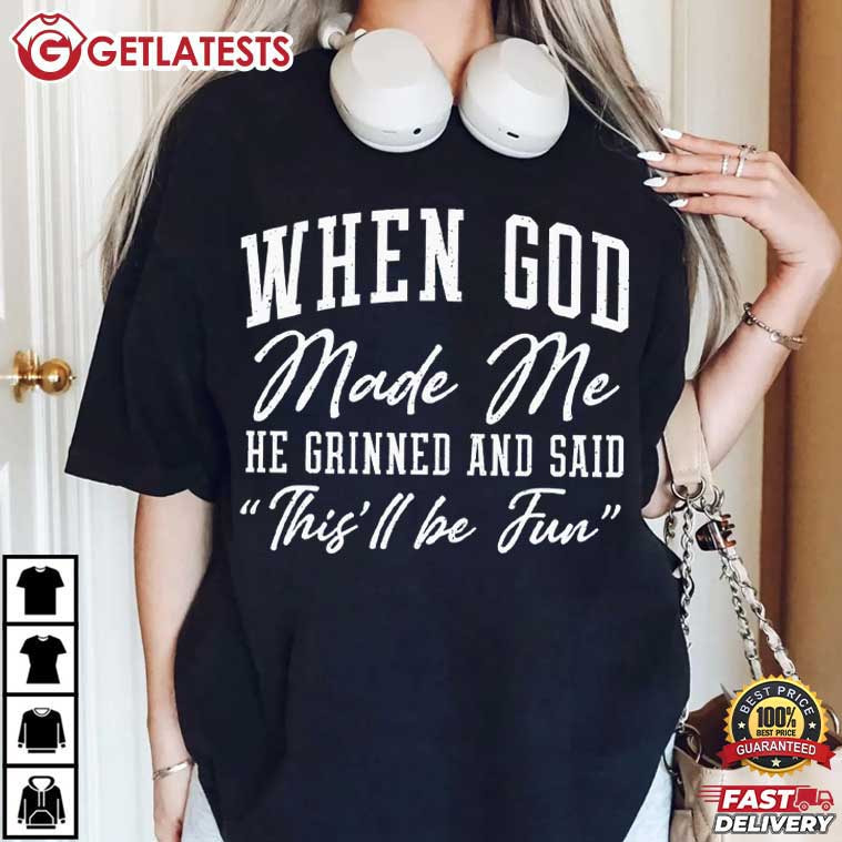Celebrate faith with a sense of humor in the When God Made Me He Grinned And Said This’ll Be Fun Christian Gift T-Shirt. The quote “When God Made Me, He Grinned And Said ‘This’ll Be Fun’” reflects the idea that everyone is uniquely created with intention, character, and a little humor mixed in.